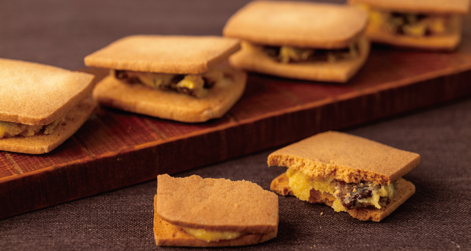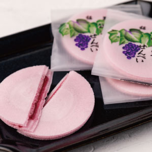 岩手県産の山ぶどうジャムを、柔らかなせんべいで挟んだしっとりとしたせんべいです。