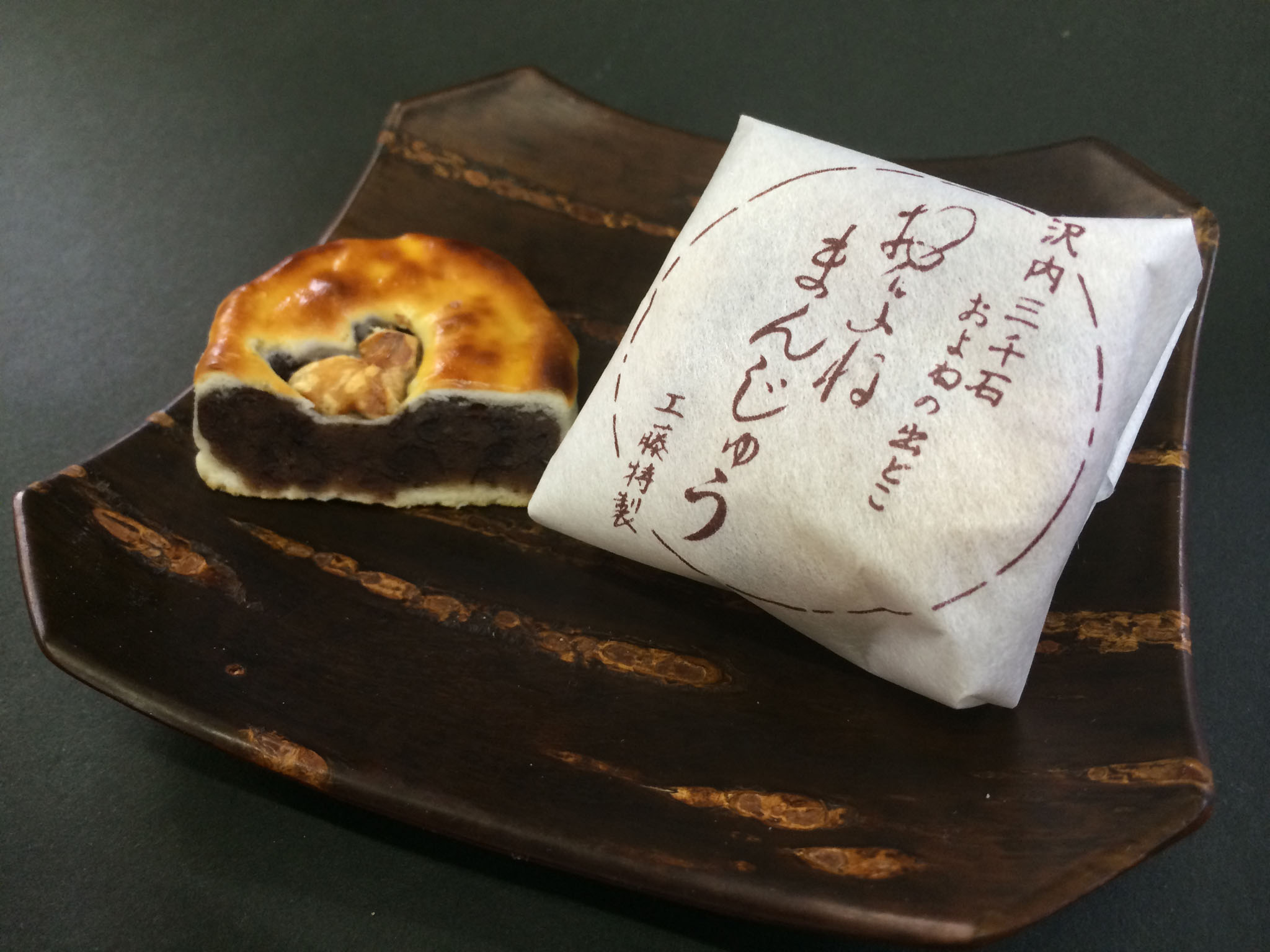昭和26年の創業当初から変わらない素朴な焼きまんじゅう。自家製のちょっと塩味の効いた粒あんを薄皮で包みクルミを乗せ、450℃の高温で焼き上げたしっとりとした焼きまんじゅうです。